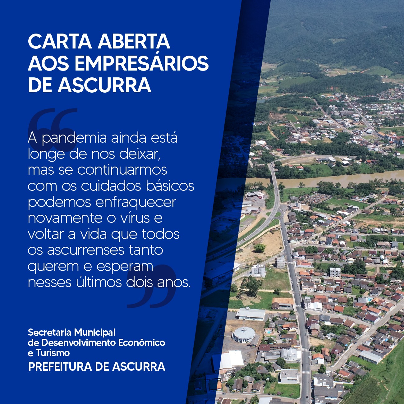 A Prefeitura de Ascurra, por meio de todas as suas secretarias, irá retornar com a campanha de conscientização para que todos reforcem-se nos cuidados básicos mas, é somente com a ajuda de vocês, empresários do município e consequentemente da população, que poderemos diminuir os casos positivos, reestabelecendo assim nossa vida normal.