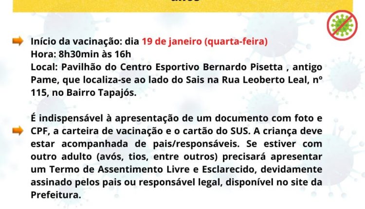 É indispensável à apresentação de um documento com foto e CPF, a carteira de vacinação e o cartão do SUS. A criança deve estar acompanhada de pais/responsáveis. Se estiver com outro adulto (avós, tios, entre outros) precisará apresentar um Termo de Assentimento Livre e Esclarecido, devidamente assinado pelos pais ou responsável legal, disponível no site da Prefeitura https://indaial.atende.net/…/baixe-aqui-o-termo-de…