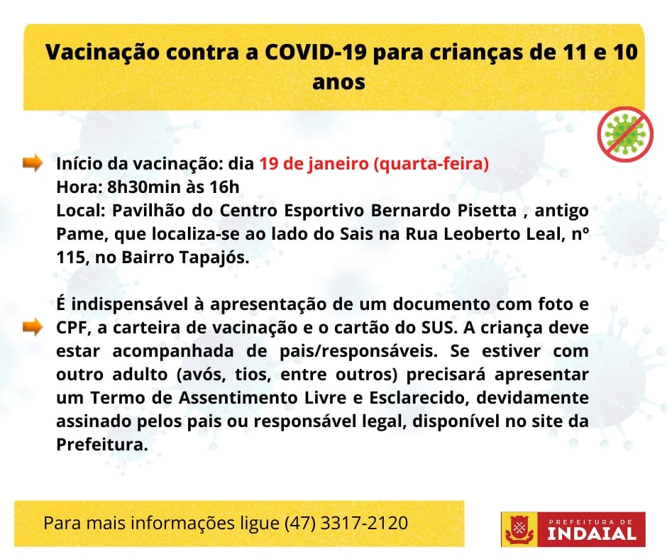 INDAIAL – A partir desta quarta-feira, dia 19 de janeiro, a Prefeitura de Indaial através da Secretaria de Saúde irá iniciar a vacinação contra a COVID-19 para crianças de 11 e 10 anos, além da vacinação para os grupos prioritários. A vacinação está ocorrendo no Pavilhão do Centro Esportivo Bernardo Pisetta, antigo Pame, que localiza-se ao lado do Sais, na Rua Leoberto Leal, nº 115, no bairro Tapajós, das 8h30min às 16h, de segunda a sexta-feira. A vacinação no pavilhão é exclusivamente para as crianças.