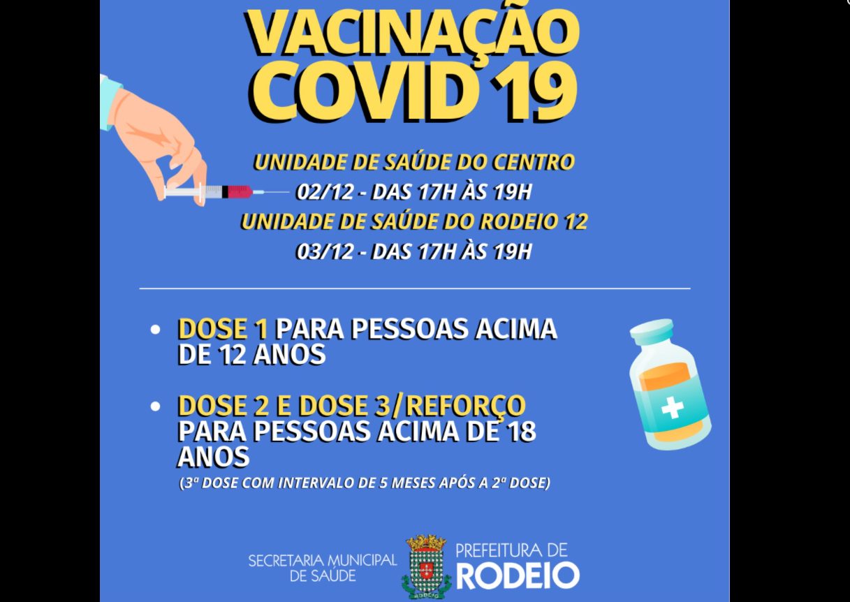RODEIO – A Secretaria Municipal de Saúde informa que a Vacinação contra a Covid-19 será realizada nos dias 02 e 03 de dezembro nos seguintes locais e horários:
