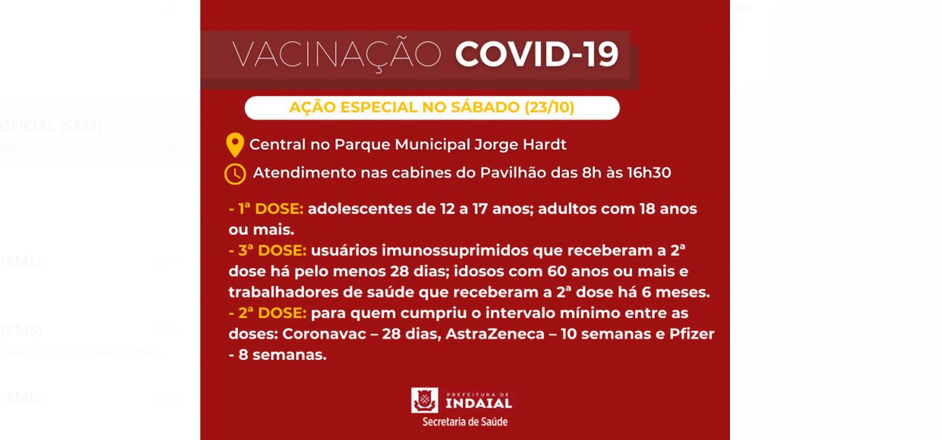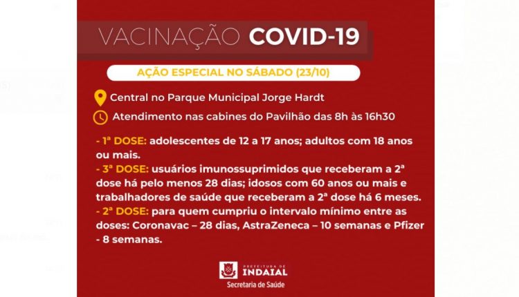 INDAIAL – Neste sábado, 23 de outubro, a Secretaria de Saúde de Indaial irá abrir a Central de Vacinação contra a Covid-19, no Parque Municipal Jorge Hardt. O atendimento nas cabines do Pavilhão Rosemeri Wolf acontecerá das 8h às 16h30, por ordem de chegada, através de senhas.