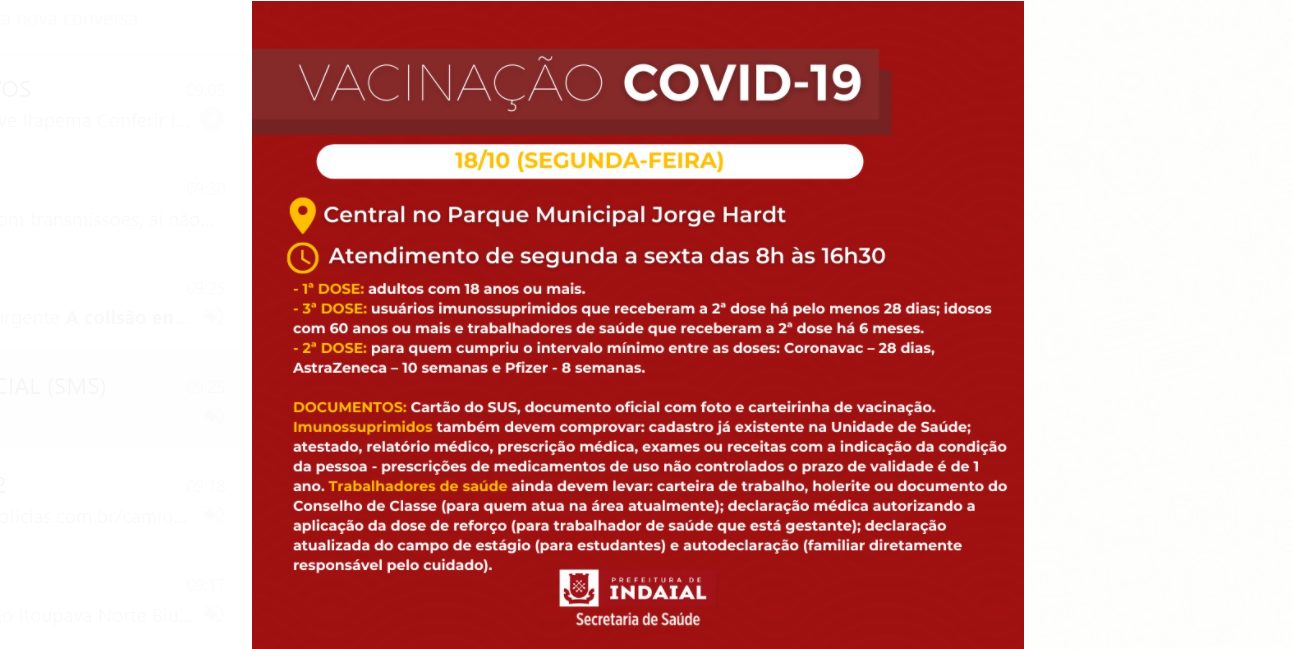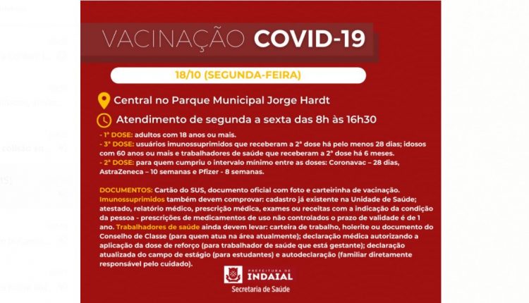 INDAIAL – A partir desta segunda, 18 de outubro, a Secretaria de Saúde de Indaial libera a 3ª dose (dose de reforço) para pessoas com 60 anos ou mais que receberam a 2ª dose há 6 meses. O atendimento é realizado na Central instalada no Parque Municipal Jorge Hardt, por ordem de chegada, através de senhas, de segunda a sexta, das 8h às 16h30.