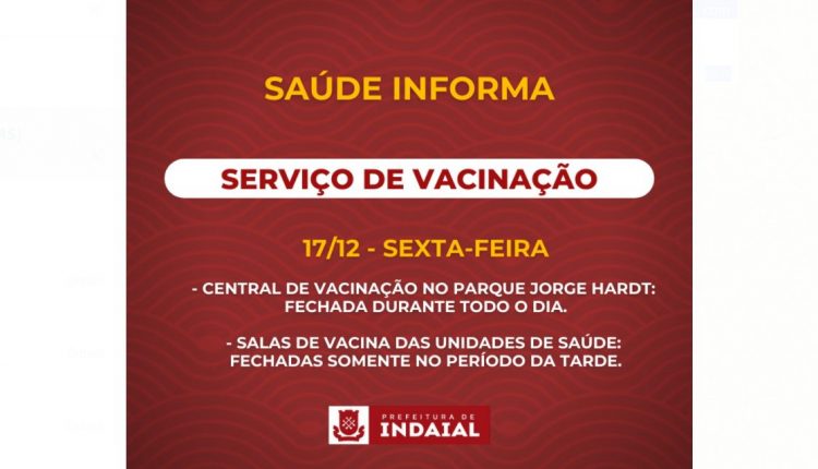 INDAIAL – A Secretaria de Saúde de Indaial orienta os usuários quanto ao serviço de vacinação nesta sexta, 17 de dezembro. A Central de Vacinação contra a Covid-19, no Parque Municipal Jorge Hardt, estará fechada durante todo o dia. Já nas Salas de Vacina das Unidades de Saúde não haverá atendimento na tarde de sexta-feira.