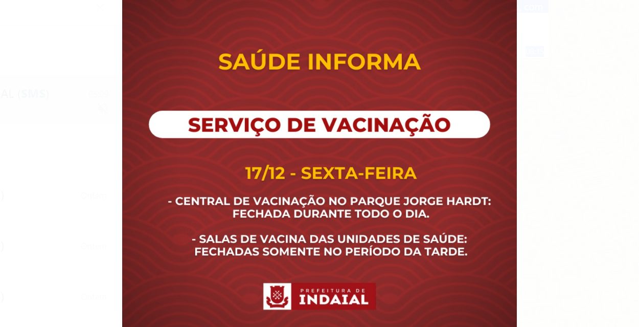 INDAIAL – A Secretaria de Saúde de Indaial orienta os usuários quanto ao serviço de vacinação nesta sexta, 17 de dezembro. A Central de Vacinação contra a Covid-19, no Parque Municipal Jorge Hardt, estará fechada durante todo o dia. Já nas Salas de Vacina das Unidades de Saúde não haverá atendimento na tarde de sexta-feira.