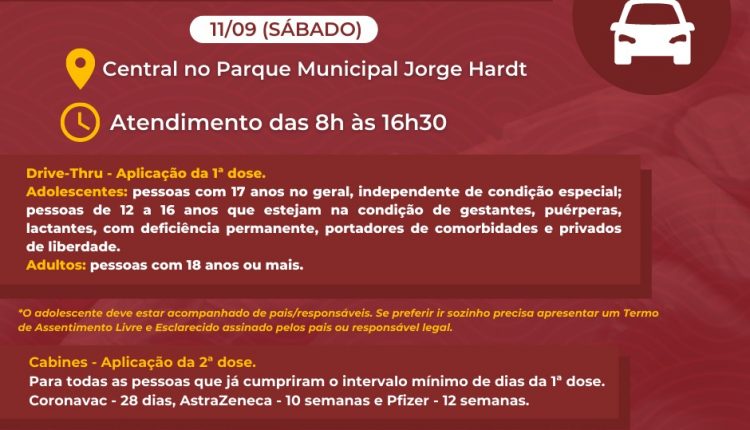 INDAIAL – Neste sábado, 11 de setembro, a Secretaria de Saúde irá promover uma edição especial do Drive-Thru para vacinação contra a Covid-19. A ação acontecerá no Parque Municipal Jorge Hardt, das 8h às 16h30. No dia, a aplicação da 1ª dose estará liberada para adultos com 18 anos ou mais e adolescentes com 17 anos no geral, independente de condição especial, e de 12 a 16 anos que estejam na condição de gestantes, puérperas, lactantes, com deficiência permanente, portadores de comorbidades e privados de liberdade.