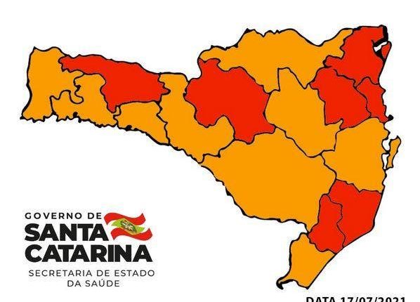 O novo mapa da Secretaria de Estado de Saúde (SES) mostra a Grande Florianópolis, o Alto Vale do Itajaí e Alto Uruguai Catarinense, o Extremo Oeste e Extremo Sul Catarinense, Meio-Oeste, Oeste, Planalto Norte e a Serra Catarinense em nível grave (cor laranja).