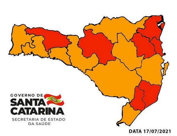 O novo mapa da Secretaria de Estado de Saúde (SES) mostra a Grande Florianópolis, o Alto Vale do Itajaí e Alto Uruguai Catarinense, o Extremo Oeste e Extremo Sul Catarinense, Meio-Oeste, Oeste, Planalto Norte e a Serra Catarinense em nível grave (cor laranja).
