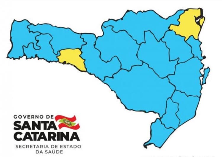 SANTA CATARINA – Santa Catarina voltou a ter duas regiões no nível alto (cor amarela) no mapa de risco da Covid-19 após três semanas consecutivas com todo o Estado no moderado (cor azul). A atualização da Secretaria da Saúde foi divulgada no sábado (1).