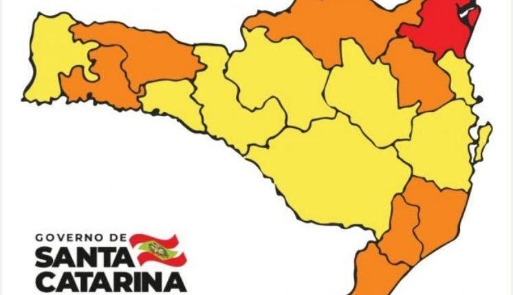 SANTA CATARINA – O mapa de risco para coronavírus em Santa Catarina voltou a divulgar uma única região de saúde em nível gravíssimo neste sábado (11). Em vermelho no mapa, cor que representa a pior situação da pandemia no Estado, aparece apenas o Nordeste.