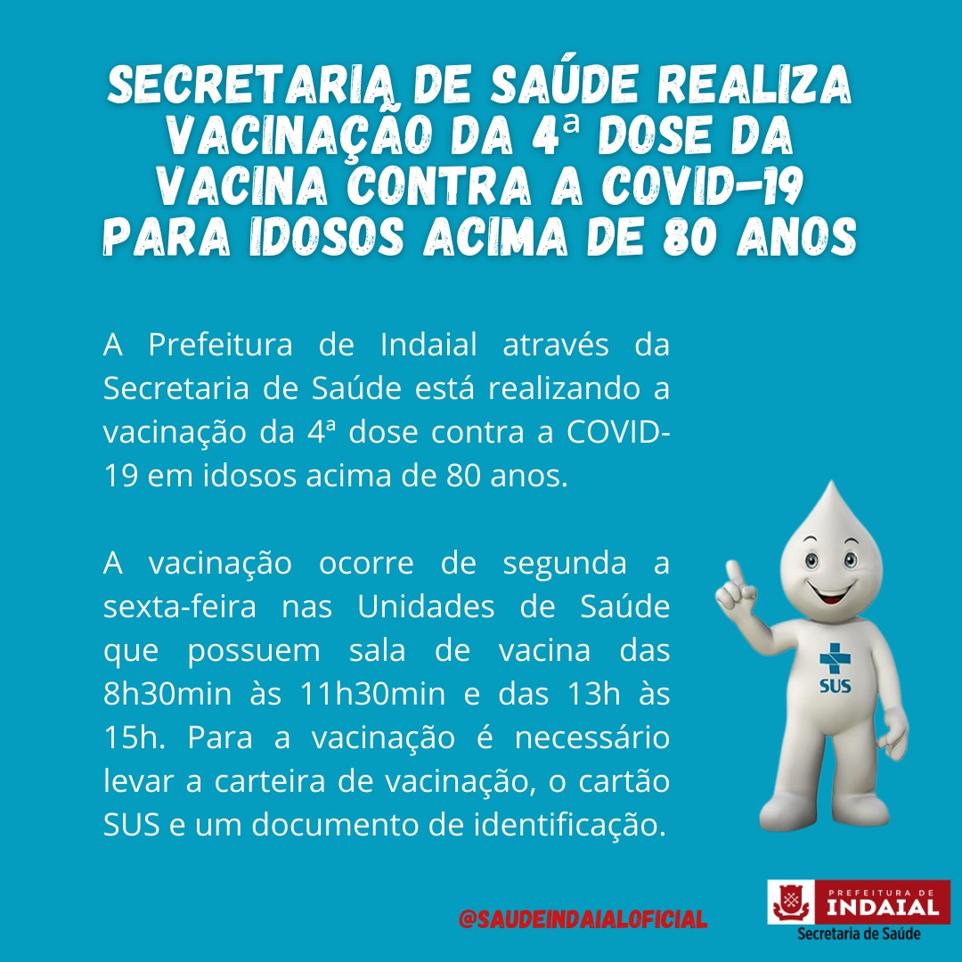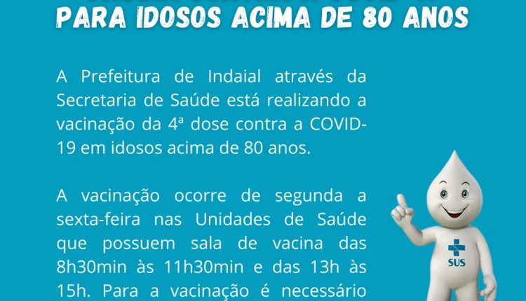 INDAIAL – A Prefeitura de Indaial através da Secretaria de Saúde está realizando a vacinação da 4ª dose contra a COVID-19 em idosos acima de 80 anos. A vacinação ocorre de segunda a sexta-feira nas Unidades de Saúde que possuem sala de vacina das 8h30min às 11h30min e das 13h às 15h. Para a vacinação é necessário levar a carteira de vacinação, o cartão SUS e um documento de identificação.