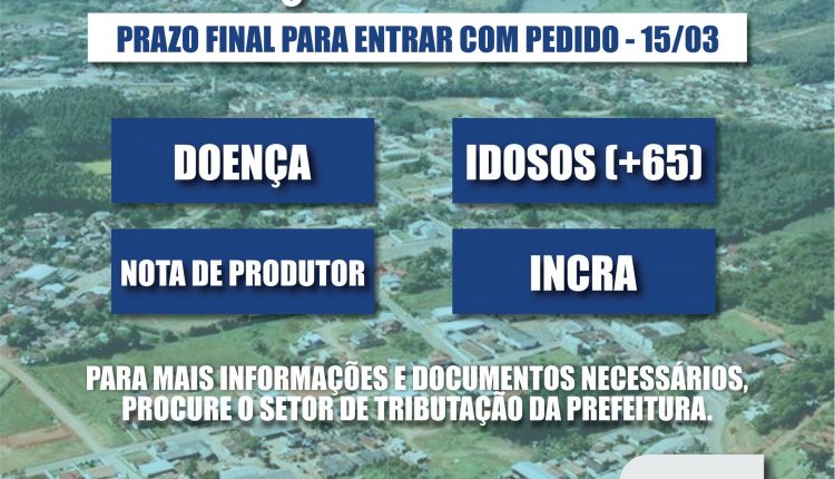 ASCURRA – O prazo final para as pessoas solicitarem isenção de seu IPTU em 2022 é no dia 15 de março. Em Ascurra, podem solicitar a isenção imóveis que pertencem a pessoas com comprovação de doença, idosos acima de 65 anos, pessoas com nota de produtor declarada e imóveis com Incra ou Área de Preservação Permanente (APP).