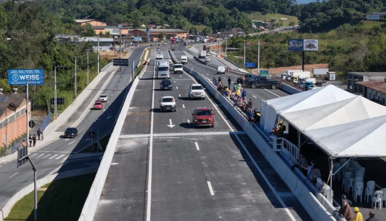 O trânsito no novo Complexo Viário do Badenfurt, na BR‑470, em Blumenau (SC), foi parcialmente liberado nesta quinta-feira (31). A primeira liberação ocorreu às 12h01, na pista sentido litoral, para quem vem do Alto Vale do Itajaí. A outra faixa, que liga o litoral ao interior, deve ser aberta após a desmontagem da estrutura do evento de inauguração, realizado no local.