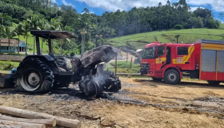 Um trator foi completamente destruído por um incêndio no inicío da tarde desta quinta-feira (23), na Estrada Geral Ribeirão Franzoi, em Pouso Redondo, no Alto Vale. O fogo começou dentro de um galpão onde o veículo estava guardado, mas o trabalho rápido do proprietário e de vizinhos impediu que as chamas se alastrassem para toda a estrutura.