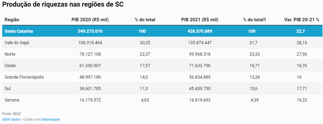 SANTA CATARINA – O Vale do Itajaí manteve o posto de região mais rica de Santa Catarina em 2021, mostram os mais novos números do Produto Interno Bruto (PIB) dos municípios catarinenses, divulgados nesta sexta-feira (15) pelo Instituto Brasileiro de Geografia e Estatística (IBGE).
