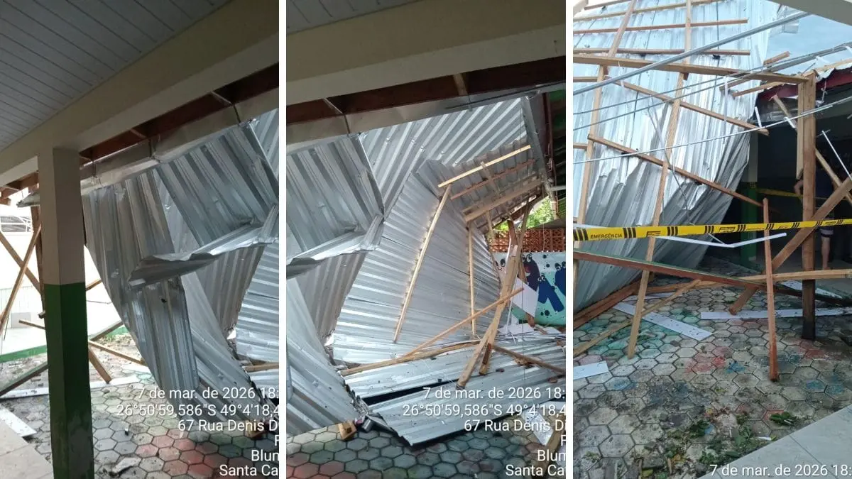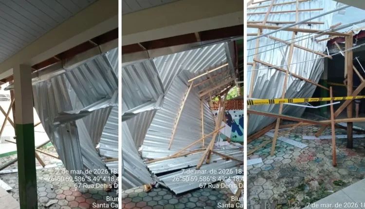 Vento arranca telhado de escola em Blumenau e alunos vão ficar sem aulas por uma semana